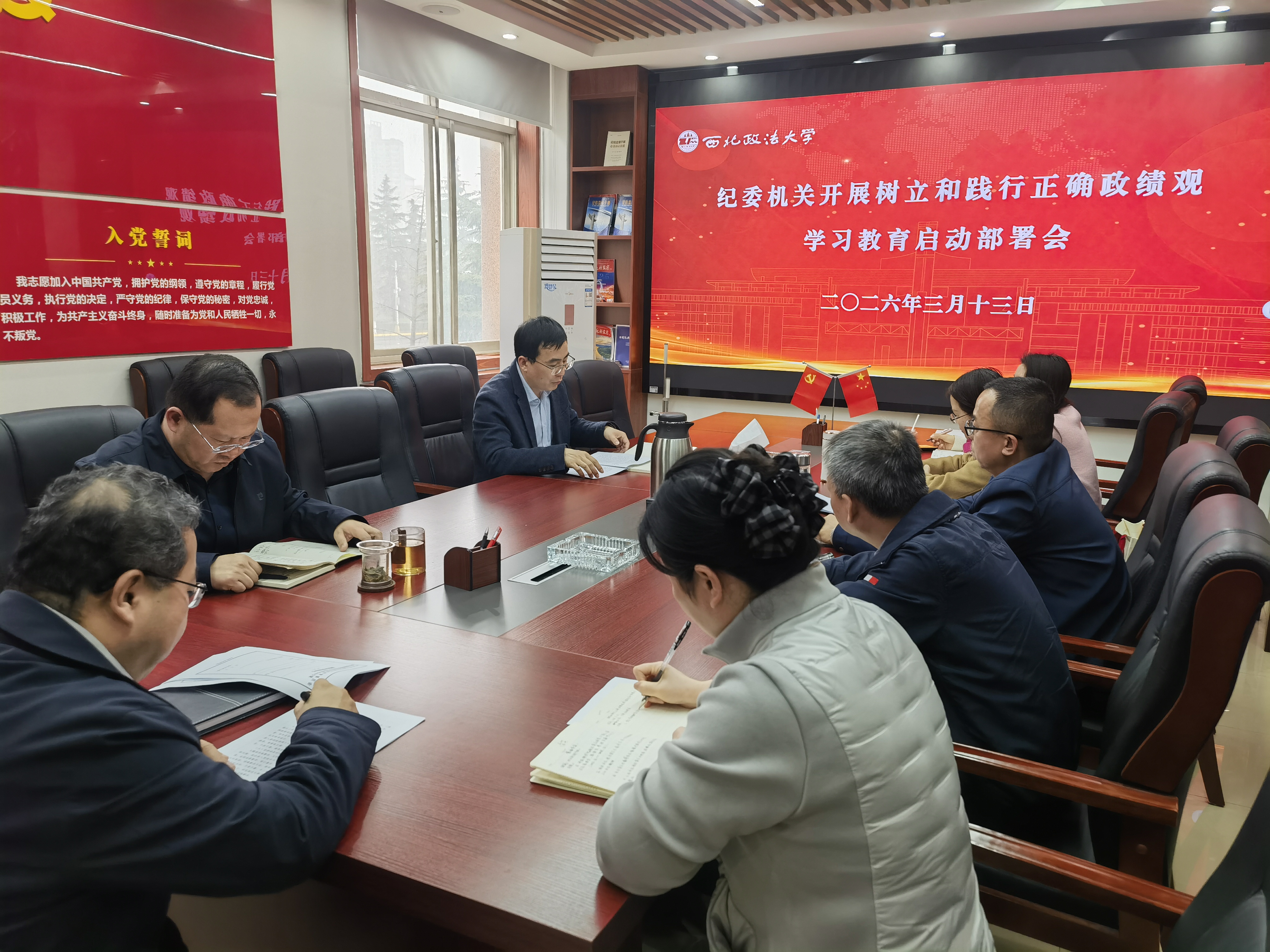 根据校党委关于开展树立和践行正确政绩观学习教育的安排部署,3月13日,纪委机关党支部召开党员大会,集中学习习近平总书记关于树立和践行正确政绩观的重要论述,对学习教育作动员部署。党支部书记杨华主持会议,全体党员干部参加。